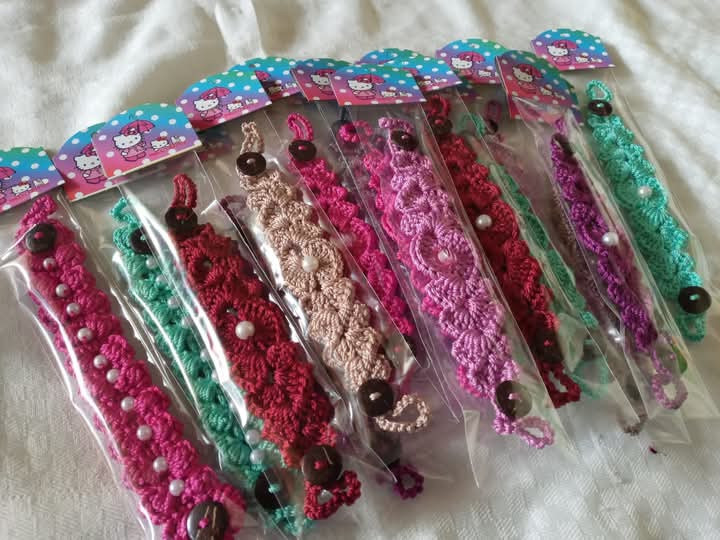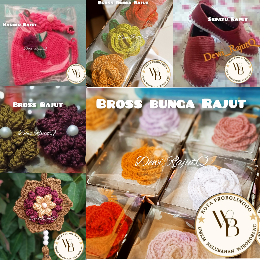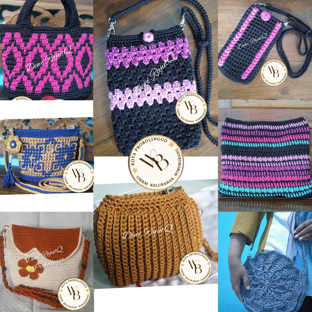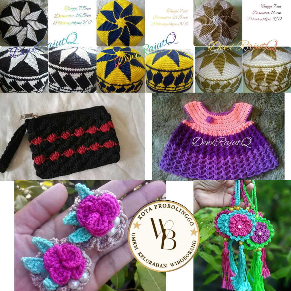 Produk yg dihasilkan berupa tas, dompet, topi, kopyah,baju, boneka, aksesoris (bros, gantungan kunci), syal dll.